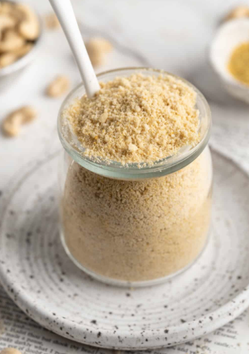 Cashewnüsse, Hefeflocken, Knoblauch, Salz. (Auch mit anderen Nüssen möglich, ungesalzen, geschält, blanchierte Mandeln, Macadamia…).